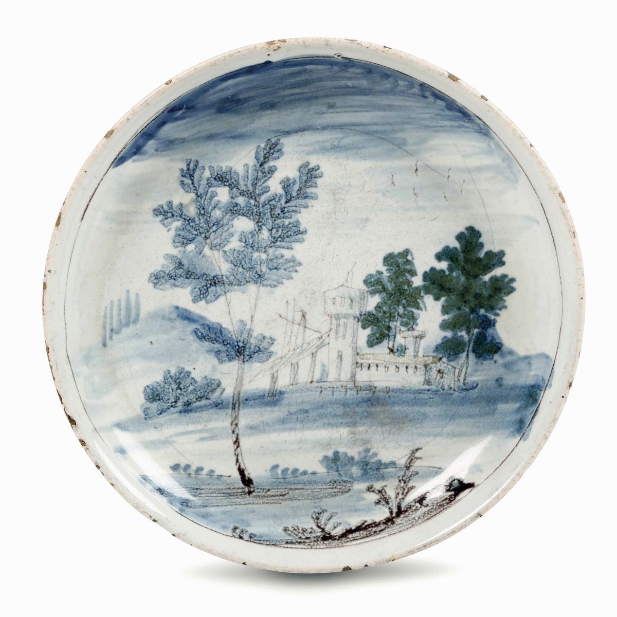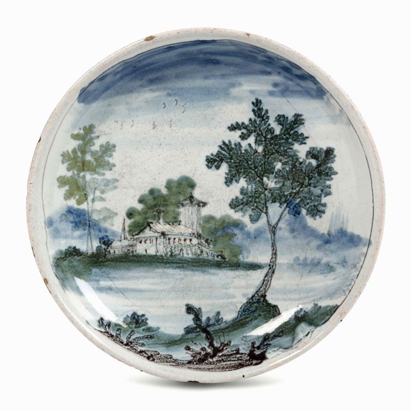 Piattino in maiolica fina su anello d’appoggio decorata con un paesaggio dipinto in policromia a gran fuoco dai colori spenti