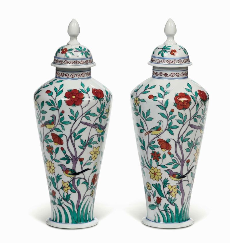 I due vasi cotiche dalla forma molto slanciata sono dipinti in policromia con un insolito motivo d’ispirazione orientale con alberi fioriti e uccellini