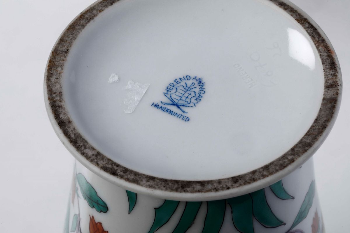 Porcellana. Marca: stemma, “Herend Hungary”, “Handpainted”, in blu; “Herend” e numeri impressi. Altezza cm 31. Conservazione: buon; un coperchio rotto in più frammenti e ricomposto in restauro