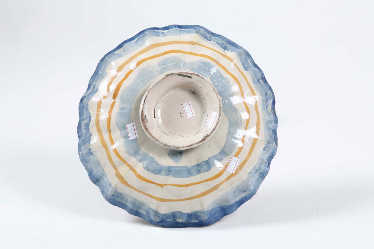 Maiolica policroma. Altezza cm 6 circa; diametro cm 28. Conservazione: rotta in più frammenti e ricomposta in restauro