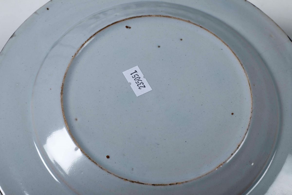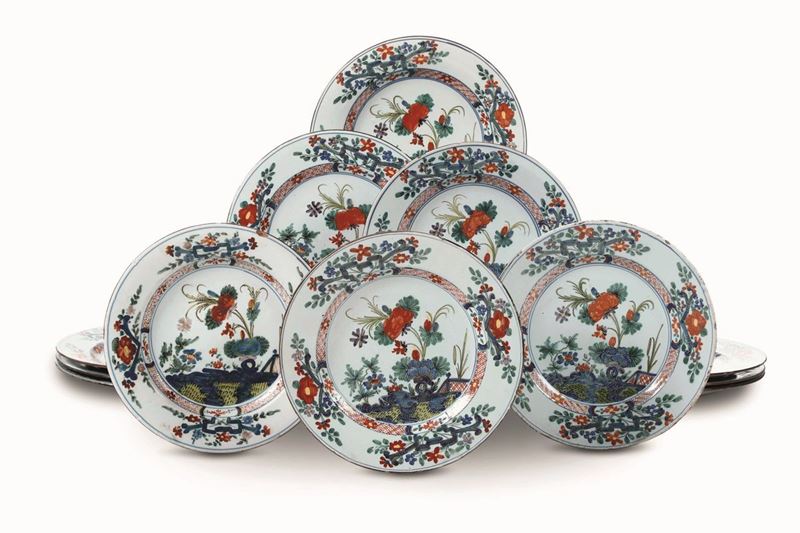 Maiolica policroma a gran fuoco. Marca: assente. Diametro cm 24 circa. Conservazione: ottima; qualche insignificante sbeccatura al bordi; due piatti con felatura; un piatto rotto in più frammenti e ricomposto in restauro; un piatto del XIX secolo