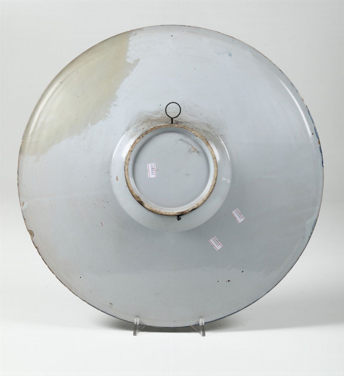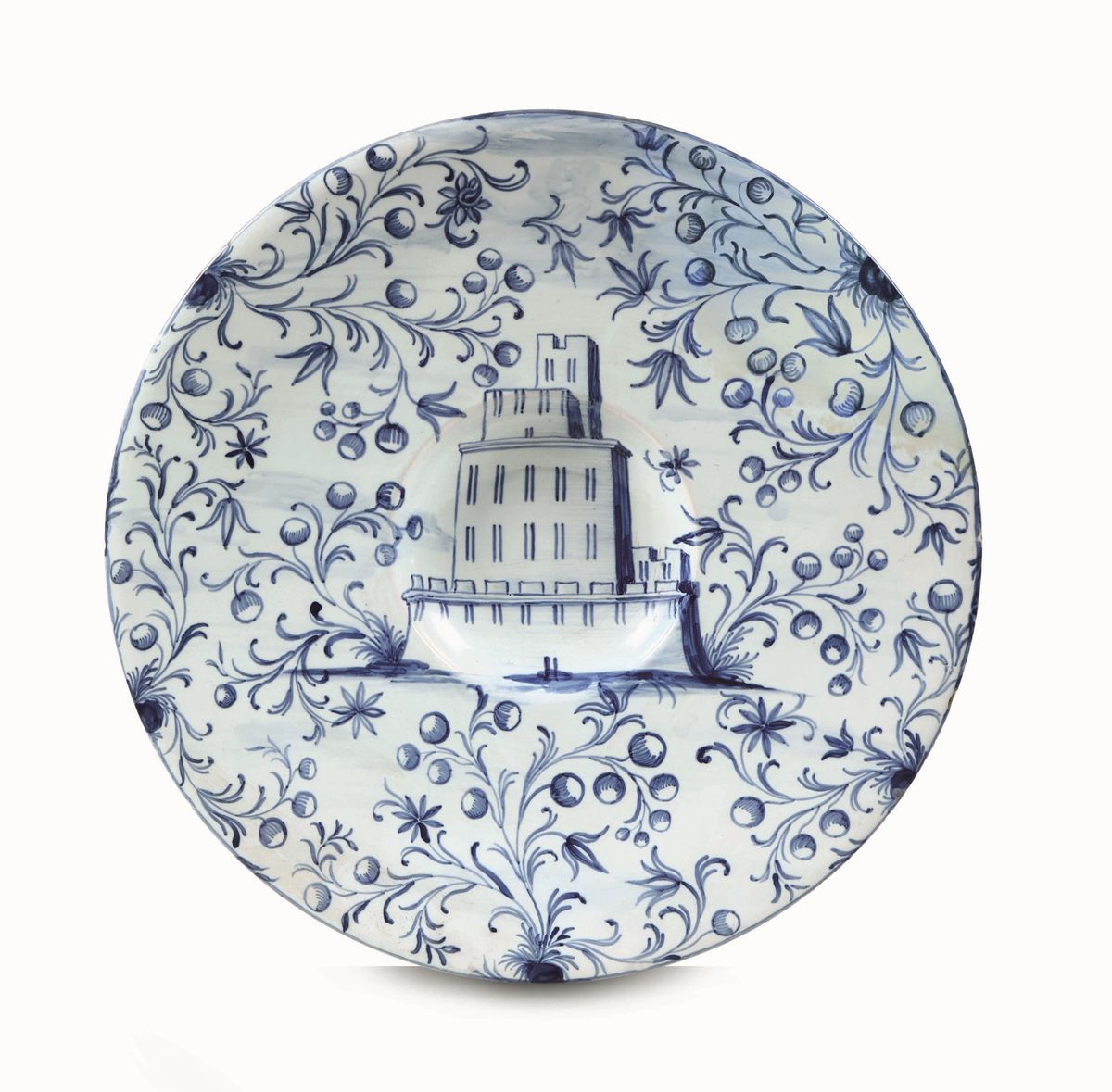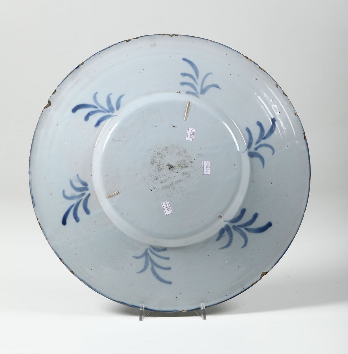 I due grandi piatti tondi con larga tesa (ma con cavetti di diversa profondità), hanno parete sottile rivestita di uno smalto leggermente azzurrato e sono decorati con un motivo “a tappezzeria“. Ciuffi fogliati, con fioretti e bacche dal disegno rapido, incorniciano il motivo architettonico che occupa il cavetto. Questa tipologia ceramica appartiene alla produzione pavese negli ultimi decenni del XVII secolo o primi del successivo