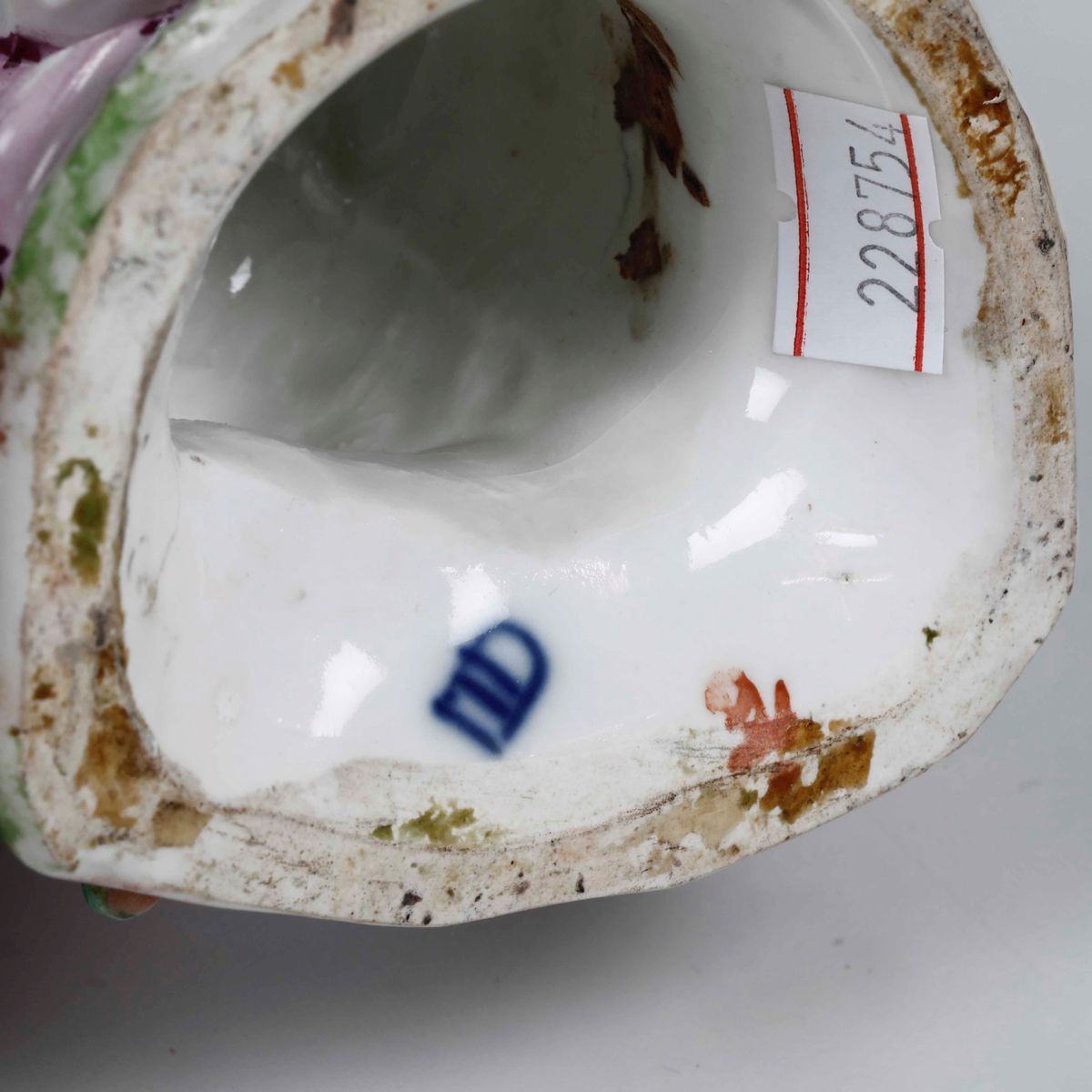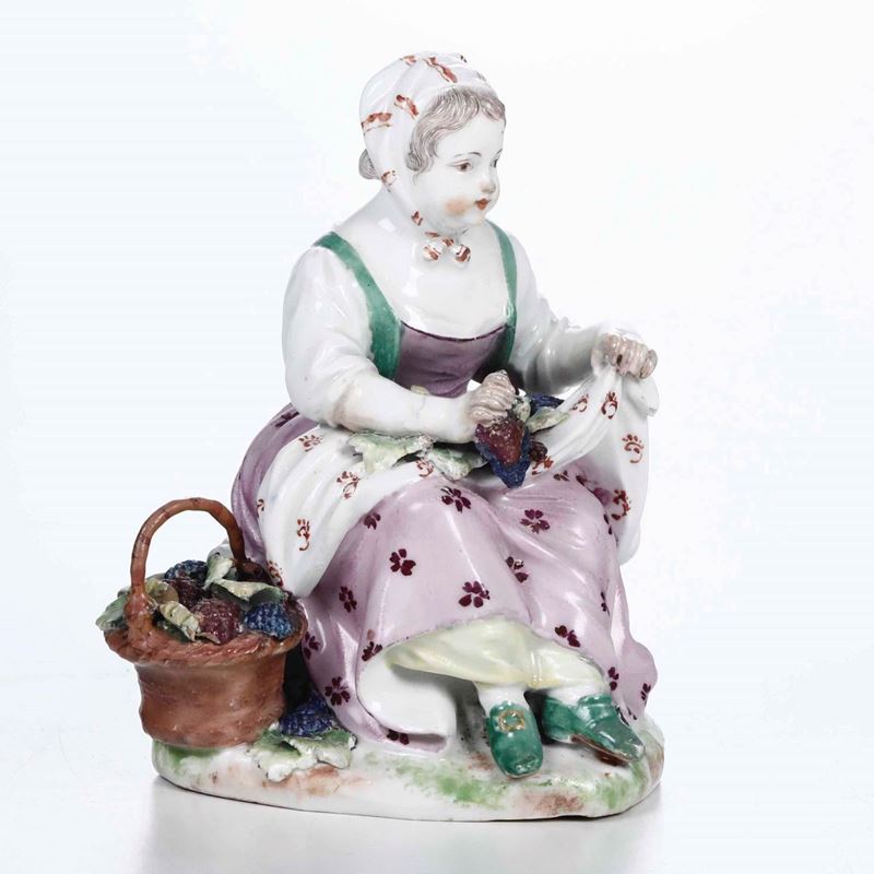Porcellana policroma. Marca: scudo in blu. Altezza cm 13,1. Conservazione: buona; minimi restauri alle dita delle mani, alla punta del piede sinistro, al manico del cestino, alla vegetazione con qualche piccola mancanza