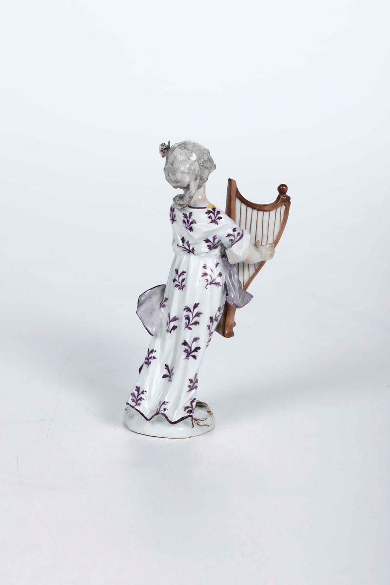 Porcellana policroma. Marca: assente o invisibile. Altezza cm 14. Conservazione: braccio destro all’altezza del gomito e arpa rincollati in restauro; piccole rotture e restauri minori