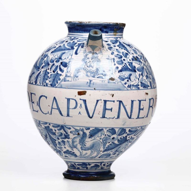 Grande brocca dal corpo ovoidale con ansa a doppio corpo che termina con due riccioli. E’ decorata con il Redentore tra due candelieri posto tra il beccuccio e il cartiglio dalla scritta medicinale “Sy De Cap Venere”. Sotto la scritta apotecaria è raffigurato un liocorno mentre il resto della superficie é ricoperto dal motivo a fiori e foglie con steli detto “foglia di prezzemolo”