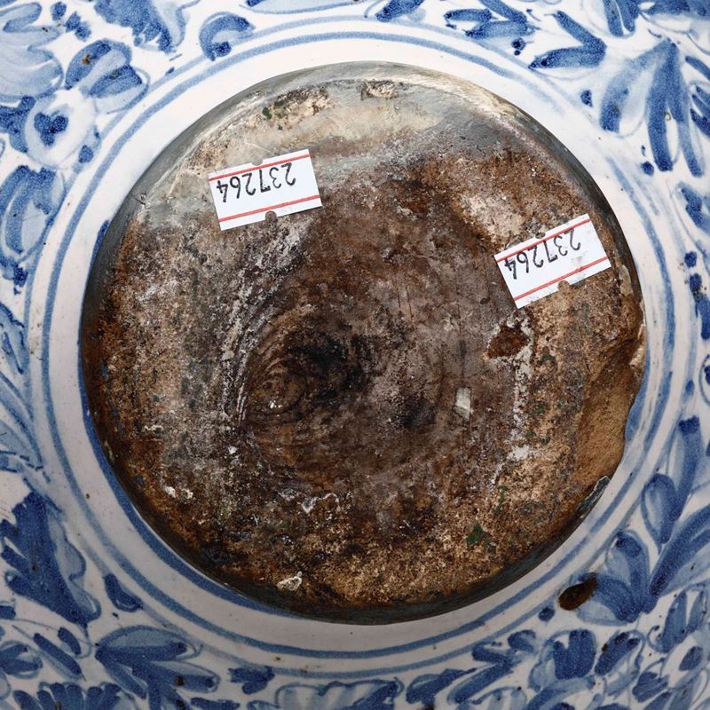 Maiolica monocroma blu su fondo berettino. Altezza cm 34 circa. Conservazione: beccuccio, ansa e parte del piede restaurati