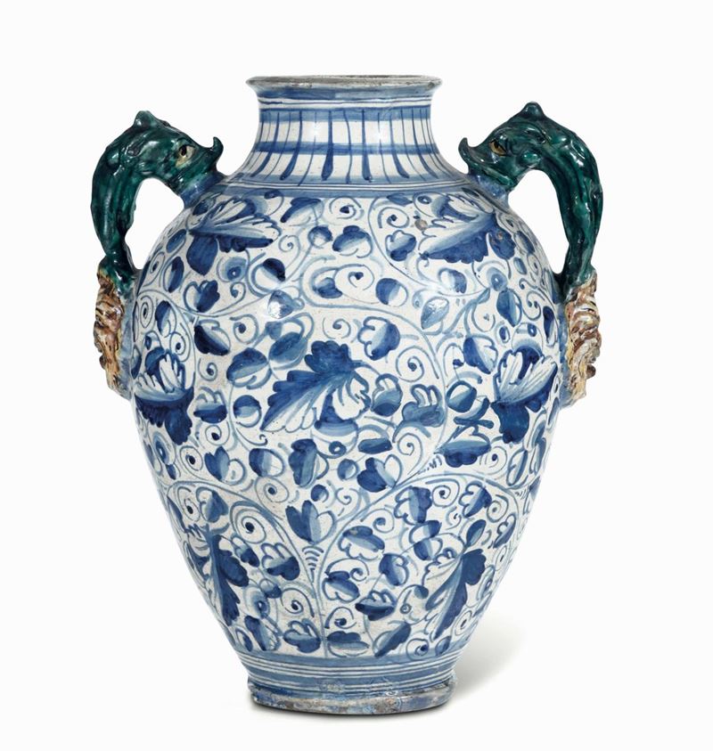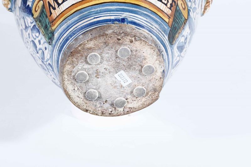 Maiolica a gran fuoco. Altezza cm 37. Conservazione: probabilmente rotto in più frammenti e ricomposto in restauro