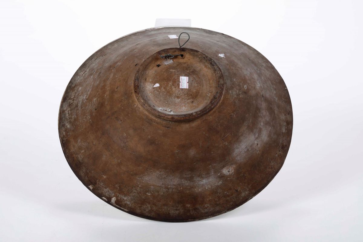 Maiolica a gran fuoco. Altezza cm 9,5; diametro cm 35. Conservazione: buona; qualche caduta di smalto specialmente al bordo