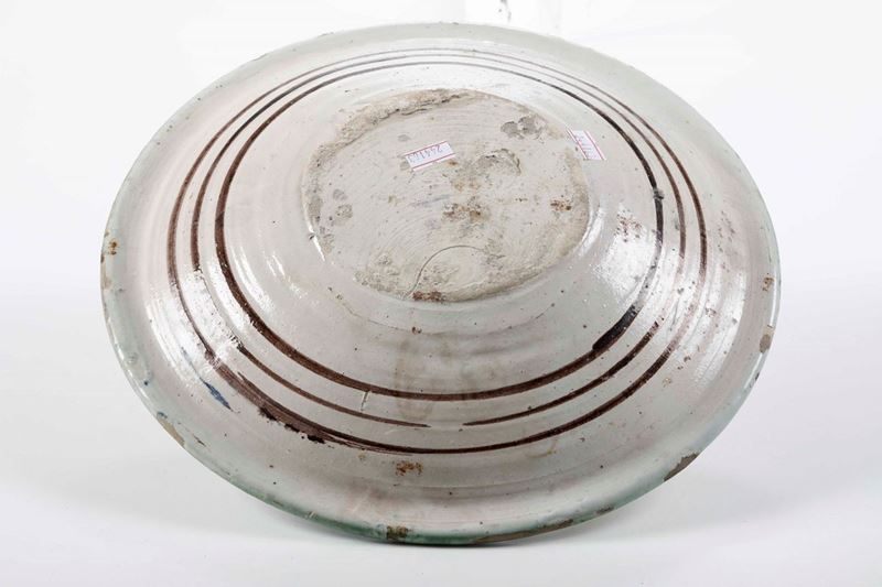 Maiolica a gran fuoco. Diametro cm 31. Conservazione: ottima; insignificanti usure di smalto al bordo