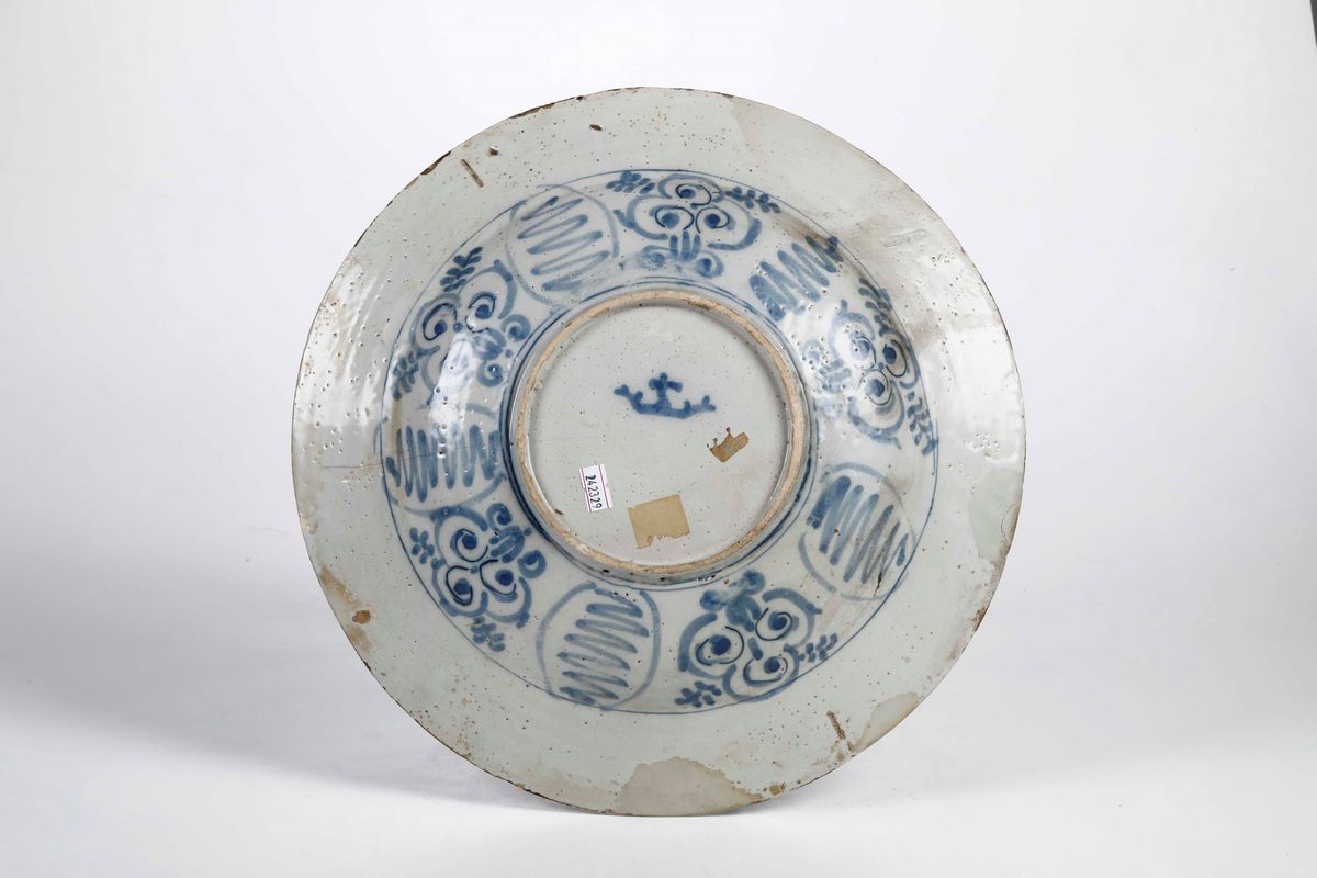 Maiolica decorata in monocromia blu di cobalto a gran fuoco. Marca: corona in blu. Diametro cm 35,8. Conservazione: sbeccature al bordo con vecchi restauri; insignificante felatura alle ore 5