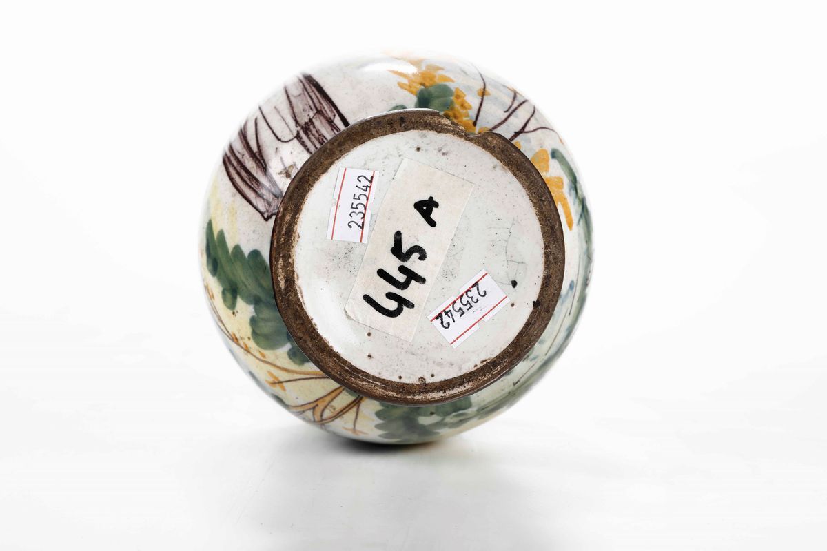 Vasetto a balaustro in maiolica, decorato con una scena istoriata, con una suora che porta un vassoio di frutti, nello stile lodigiano del Settecento, noto per il corredo farmaceutico di Novellara. (Cfr. C.Ravanelli Guidotti, La farmacia dei Gesuiti di Novellara, catalogo della mostra, Faenza 1992)
