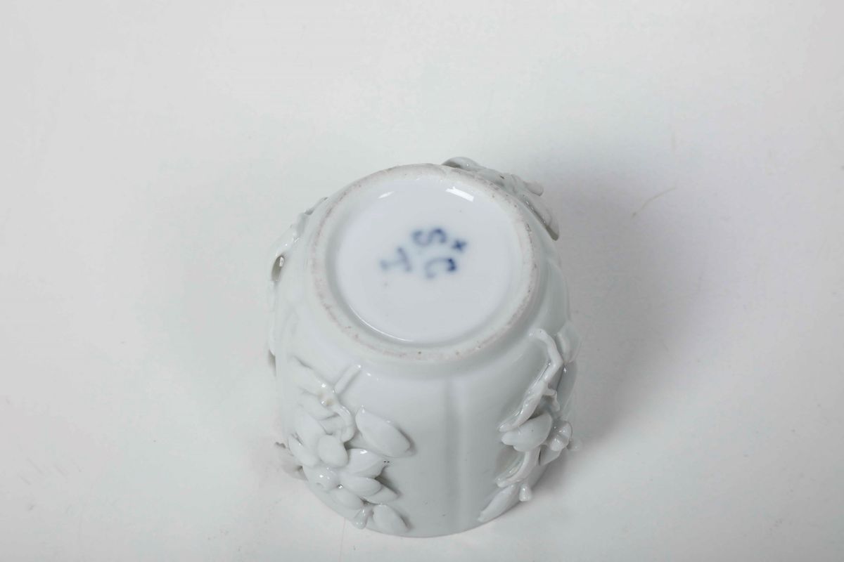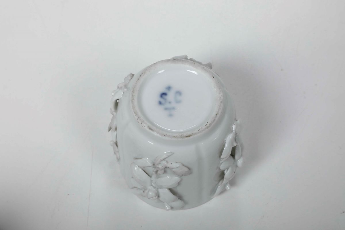 Le sei tazze con i loro coperchi, in porcellana bianca, sono decorate con ramoscelli con fiore e foglie applicati, racchiusi in quattro riserve delimitate da scanalature verticali