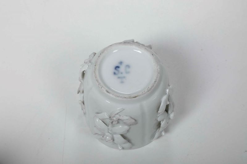 Porcellana. Marca: lettere “SCT” sormontate da croce, in blu. Altezza cm 7,5. Conservazione: ottima; una tazza con vecchio restauro al bordo