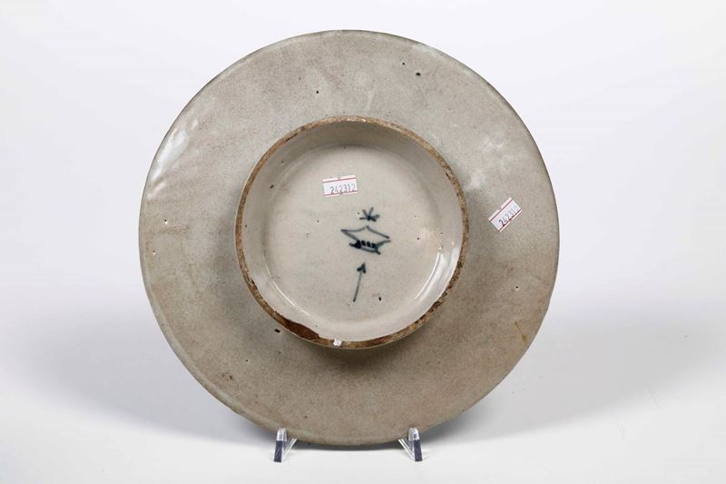 Maiolica monocroma blu di cobalto. Marca: corona con asta e asterisco in blu. Dimenisoni: altezza cm 4,5; diametro cm 27,2. Conservazione: piccole sbeccature al bordo