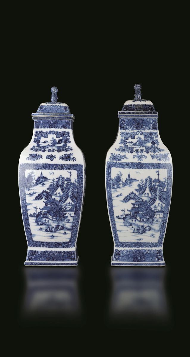 Coppia di grandi potiches a sezione rettangolare in porcellana bianca e blu con decori floreali e raffigurazioni di paesaggio entro riserve, Cina, Dinastia Qing, epoca Qianlong (1736-1796)