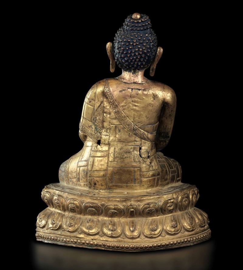 Figura di Buddha Sakyamuni seduto su doppio fiore di loto in bronzo dorato con tracce di policromia, Tibet, XVII-XVIII secolo