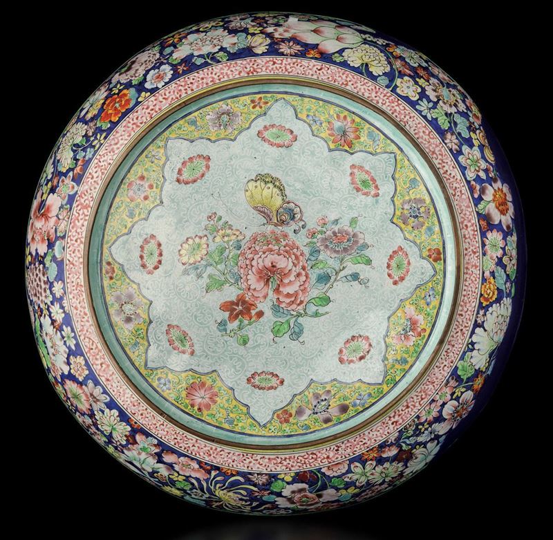 Piatto a smalti raffigurante saggio con discepolo entro paesaggio e decori floreali entro riserve, Cina, Dinastia Qing, epoca Yongzheng (1723-1735)