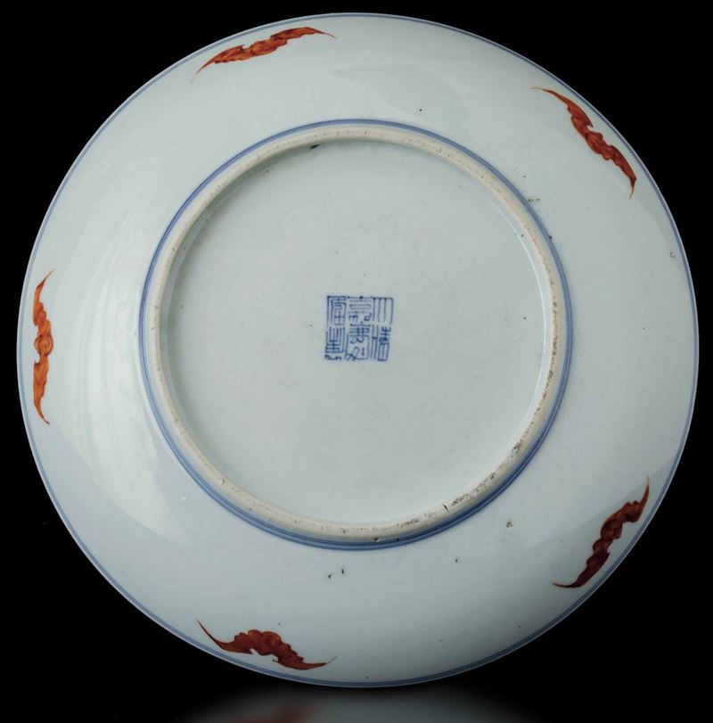 Piatto in porcellana a smalti policromi con Ruyi e soggetti naturalistici, Cina, marca e del periodo Jiaqing (1796-1820)