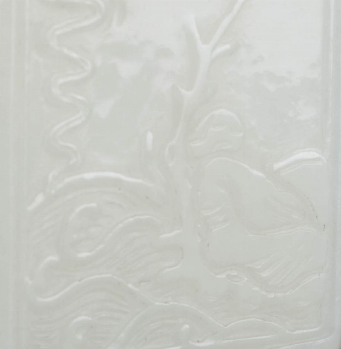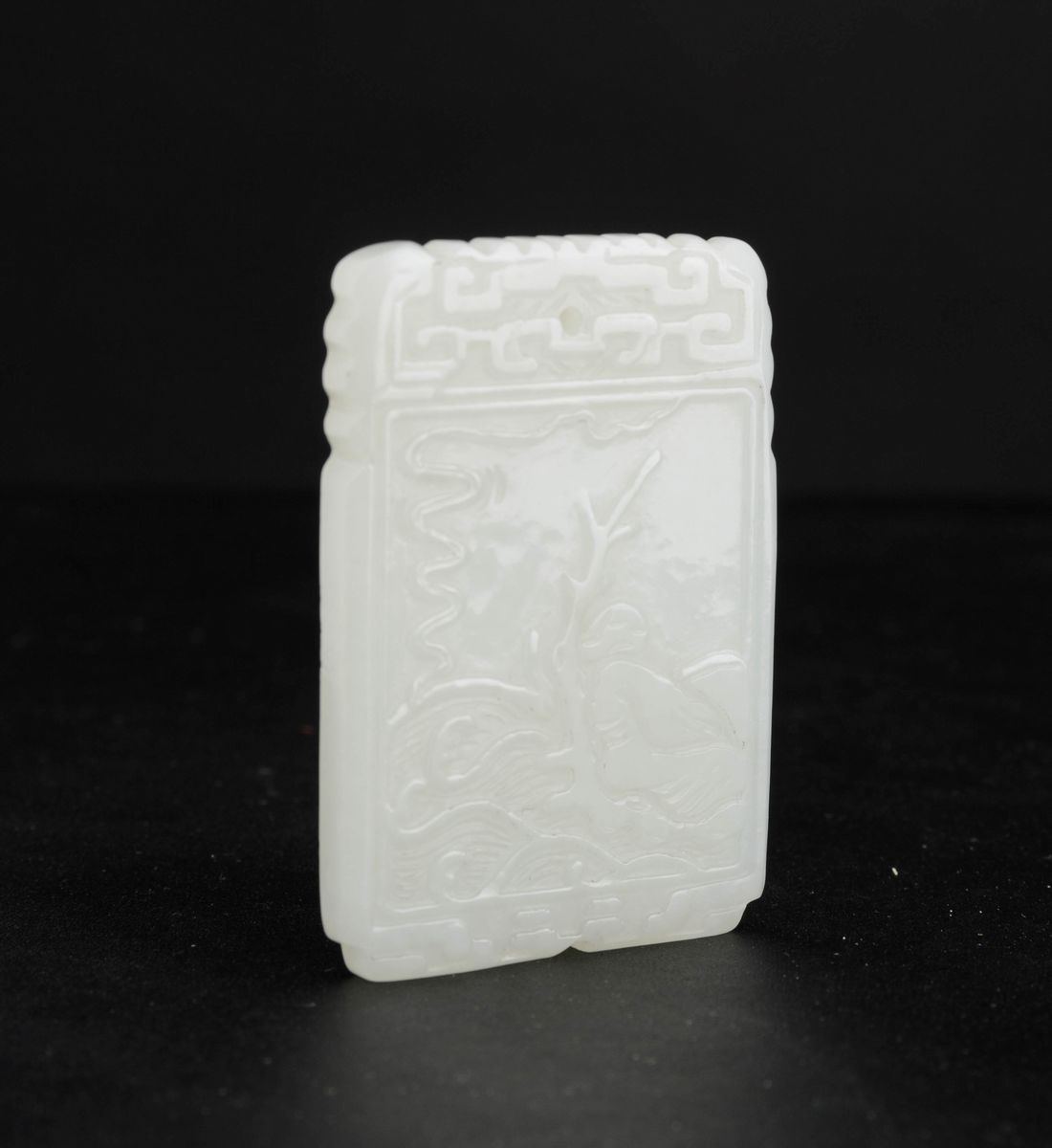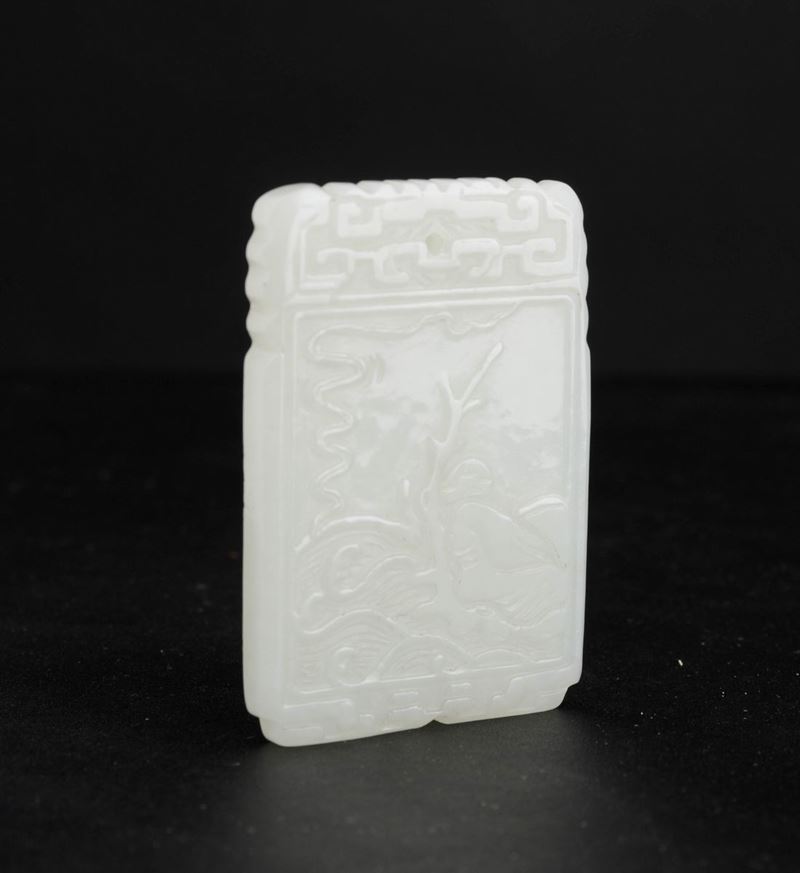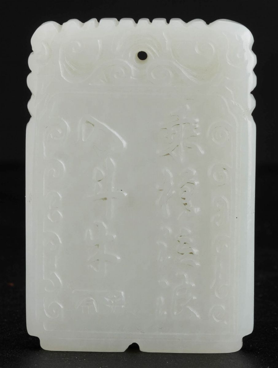 Piccolo pendente scolpito in giada bianca con soggetto naturalistico entro riserva e iscrizione al retro, Cina, Dinastia [..]