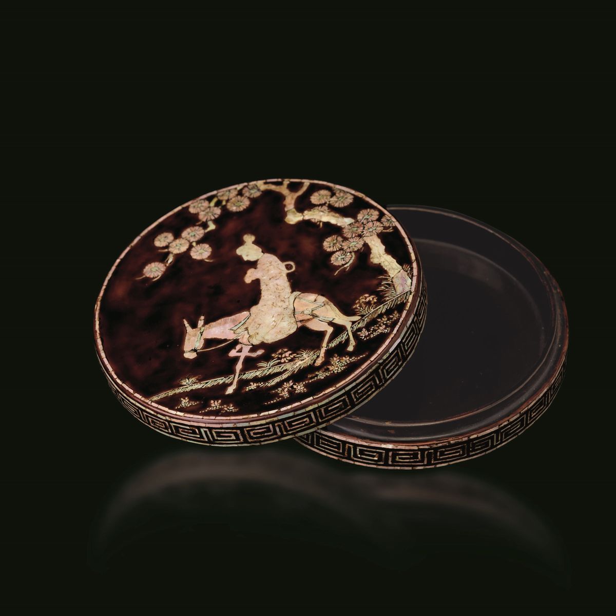 Scatola circolare in tartaruga con coperchio decorato in madreperla, Cina, Dinastia Qing, epoca Kangxi (1662-1722)