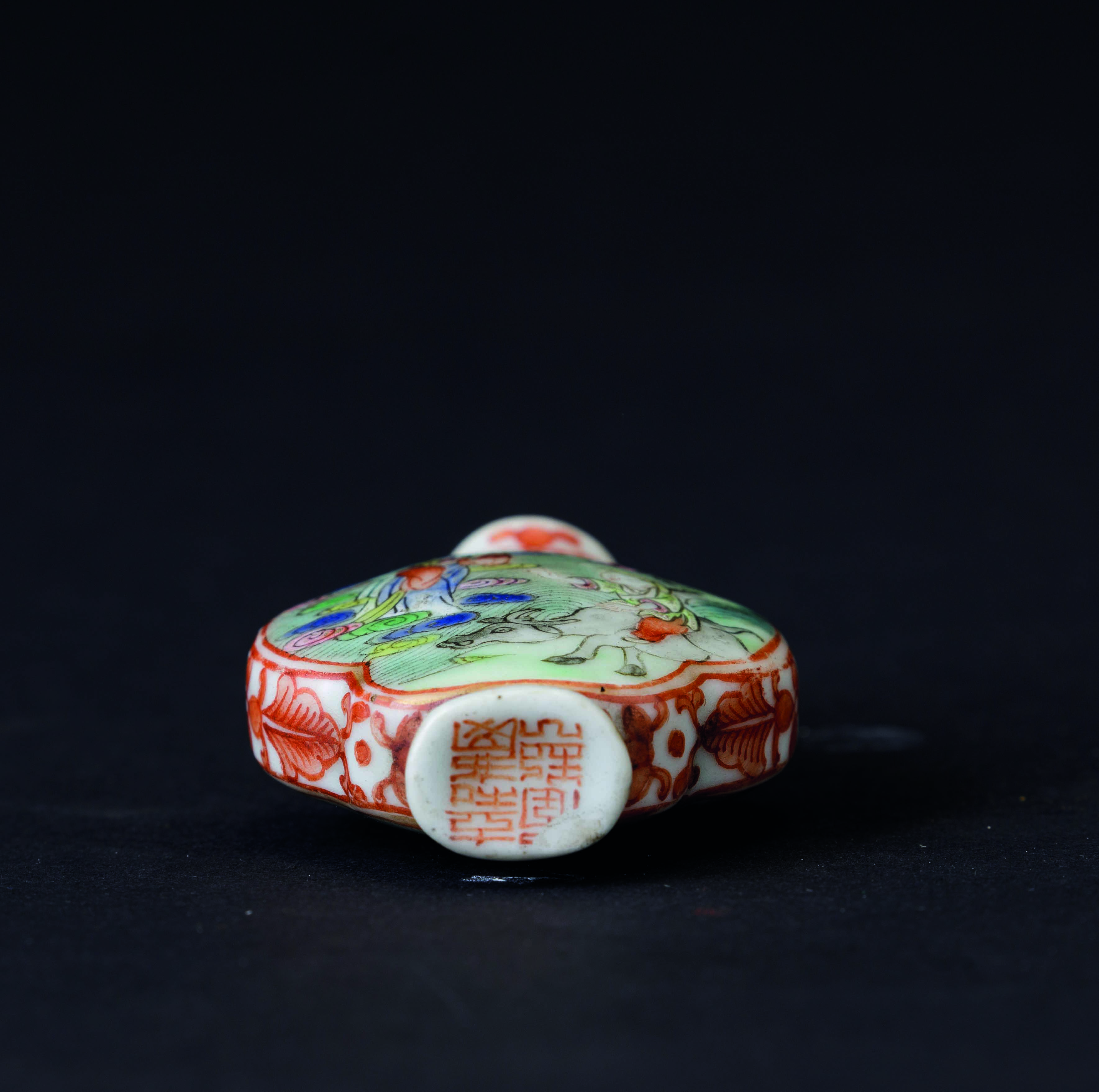 Snuff bottle in porcellana con decori floreali, figure di saggi e fanciulle entro paesaggio, Cina, Dinastia Qing, marca [..]
