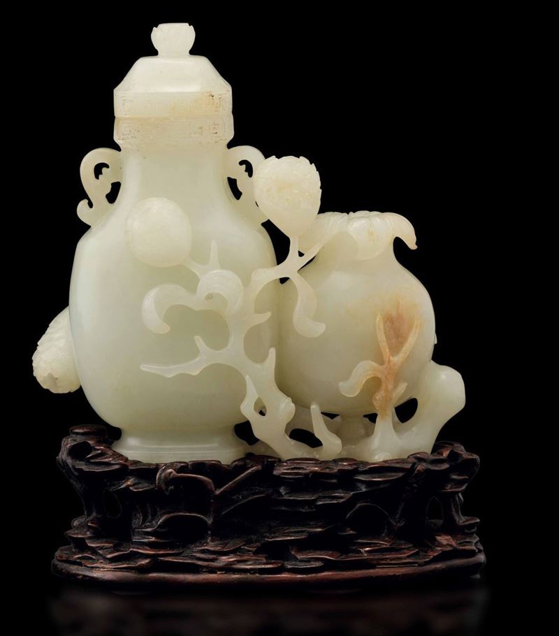 Vaso con coperchio finemente scolpito in giada bianca e russet decorato con elementi vegetali a rilievo e melograno, Cina, [..]
