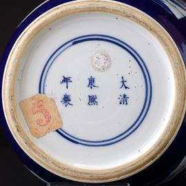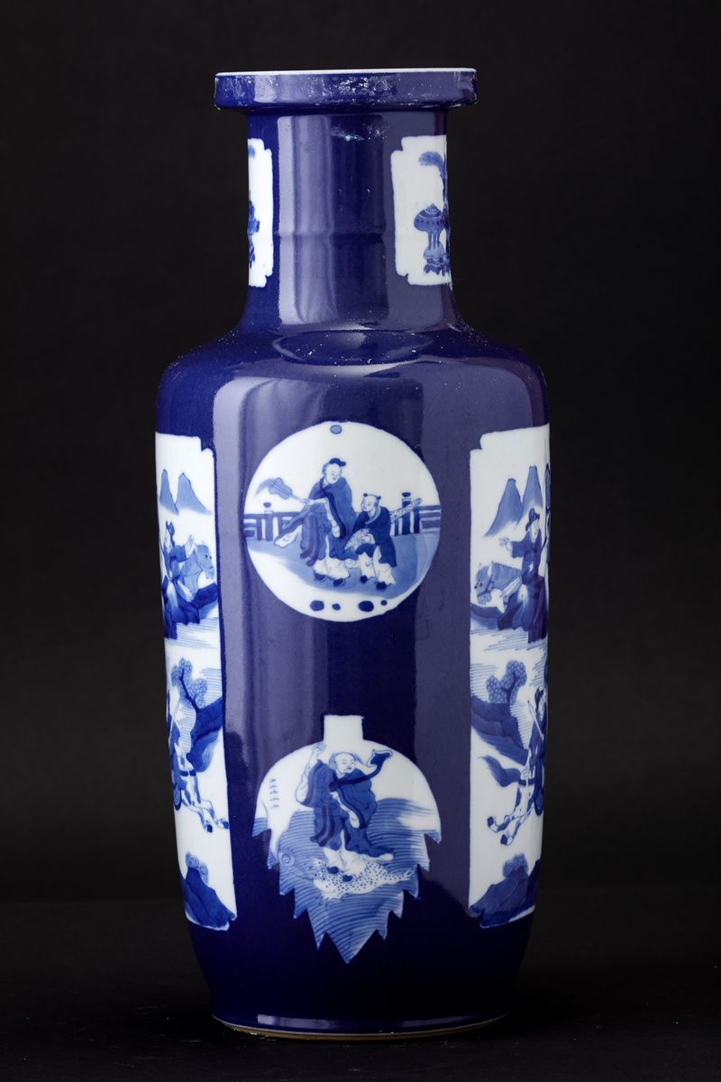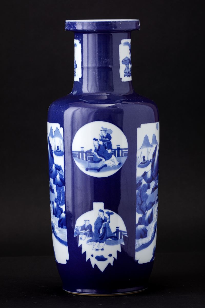 Vaso Rouleau in porcellana bianca e blu con cavalieri, saggi e soggetti naturalistici entro riserve, Cina, Dinastia Qing, [..]