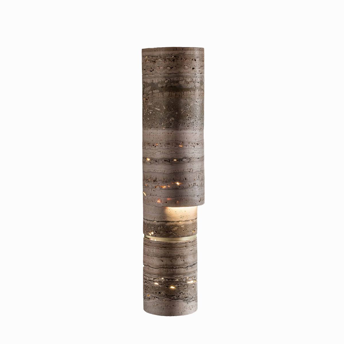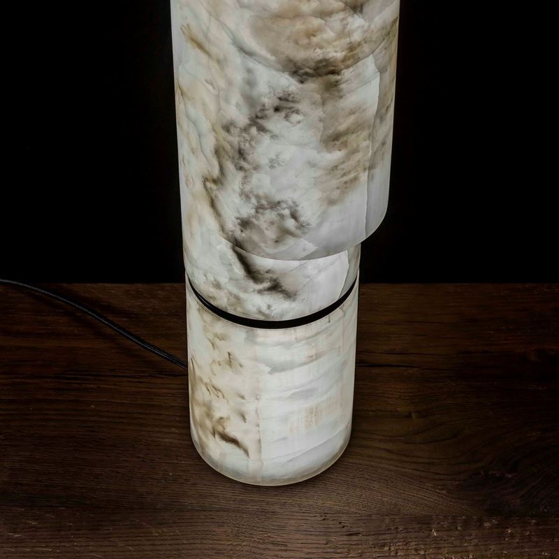 The generous table lamp TEST-ONE surprises since the first touch of its neck. The modern menhir take on a life of its own, expressing in full the dedicated mate- rials: the sand polished Ice Onyx becomes white as a moon, the stone turns from sculptural opalescence to bright brutalism; mysterious as a dying star when the nucleus of the Rapolano Travertine shines through its natural cavities and the open shape resulting from the peculiar undercut crafting.