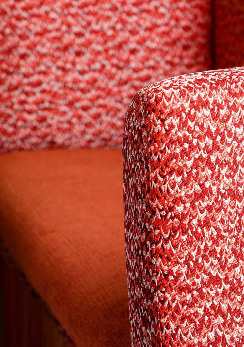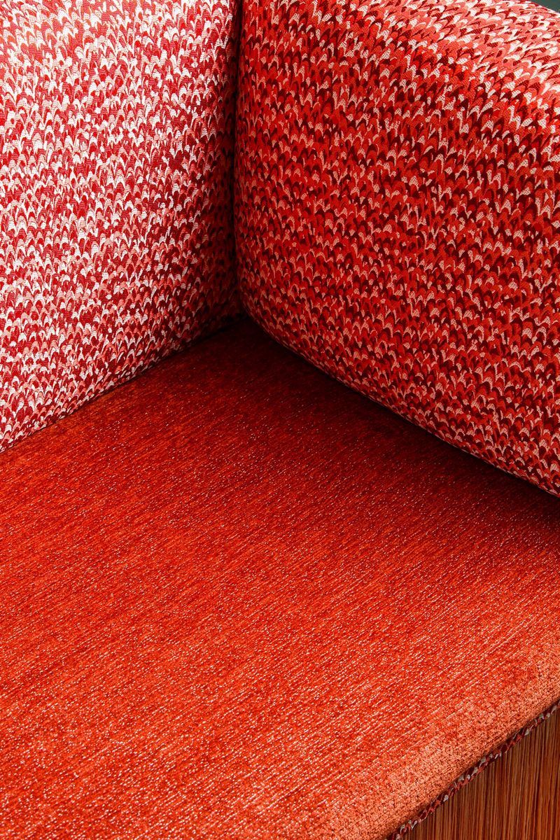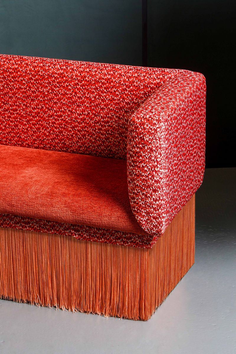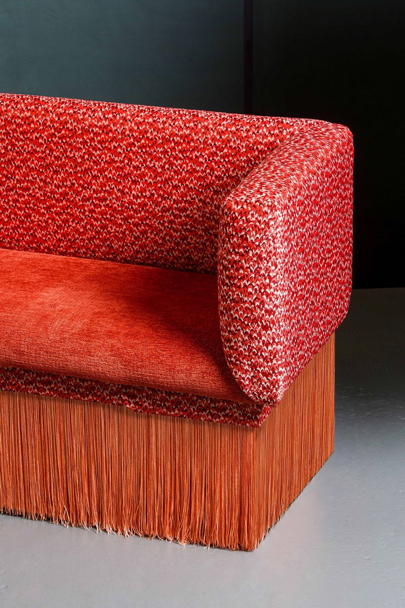 are in Coral tones, velvet for the base and microtexture for the back; at auction an element with armrest on both sides, the one located in the front with respect to the central entrance of the tram. For the Cambi auction, the original seat was integrated, based on a design by Cristina Celestino, with a base covered with tripoli fringes.