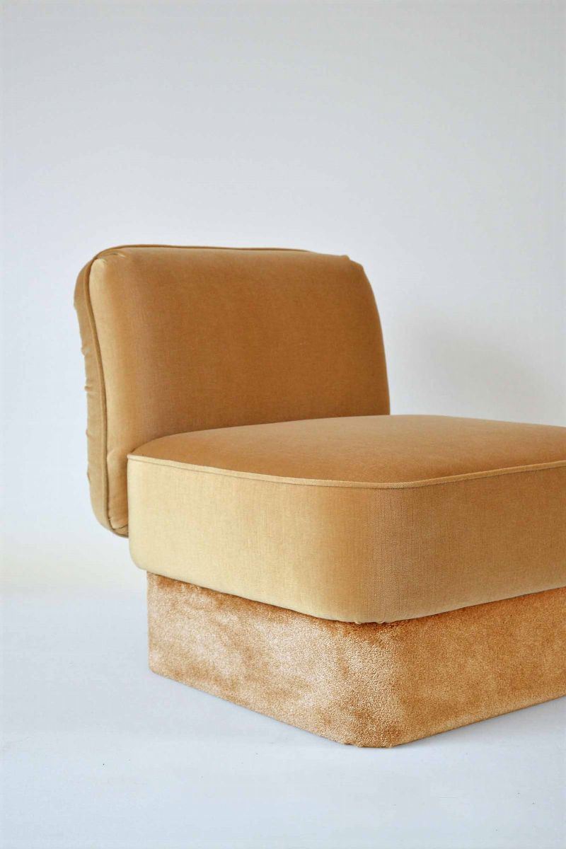 The Powder armchair draws on the imagery of d’antan powder cases and their tops: pleated surfaces with small handles like jewels. The volume of the seat is pure. It is made of a base and a back cushion which on its back presents a pleated feature with the detail of a round brass handle. The volumes are suspended on a in-back base covered in soft carpet. This product is handmade in Italy and manufactured with excellent materials.