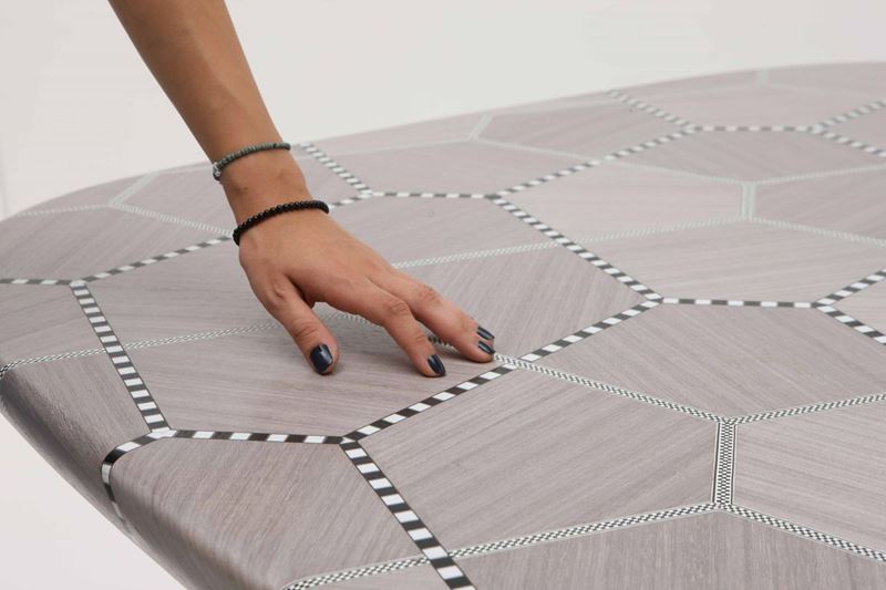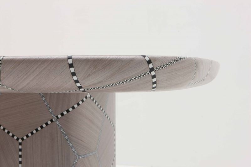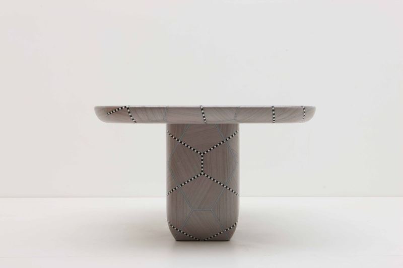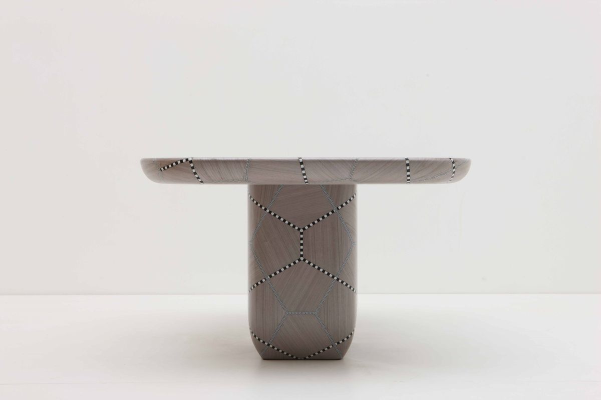 A synergy between the organic markings of nature and the rational lines of geometry, the Carapace tables play with exaggerated cel- lular patterns through the craft of marquetry whereby subtle shifts in wood veneers emphasize the shell- like patterns. The grey tones of the