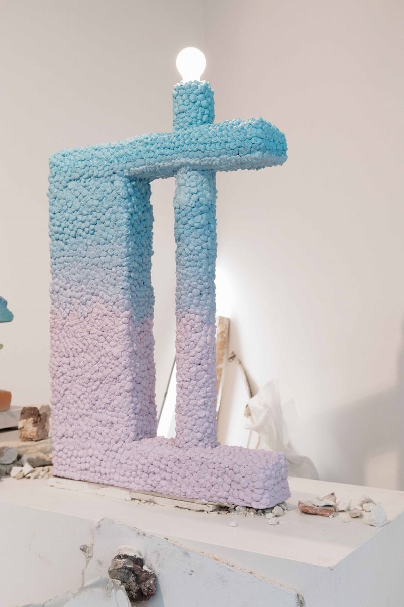 Using pale pink-and blue-dyed concrete, the Neon lamp was born from the nocturnal lu- minous atmosphere of Japanese cities. The particular ambiance created by neon lights is transcribed by the chromatic range of this lamp.