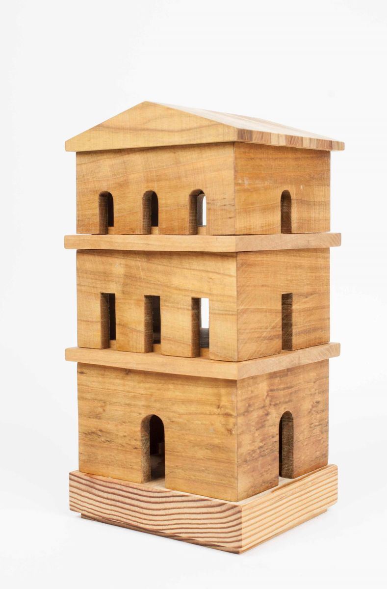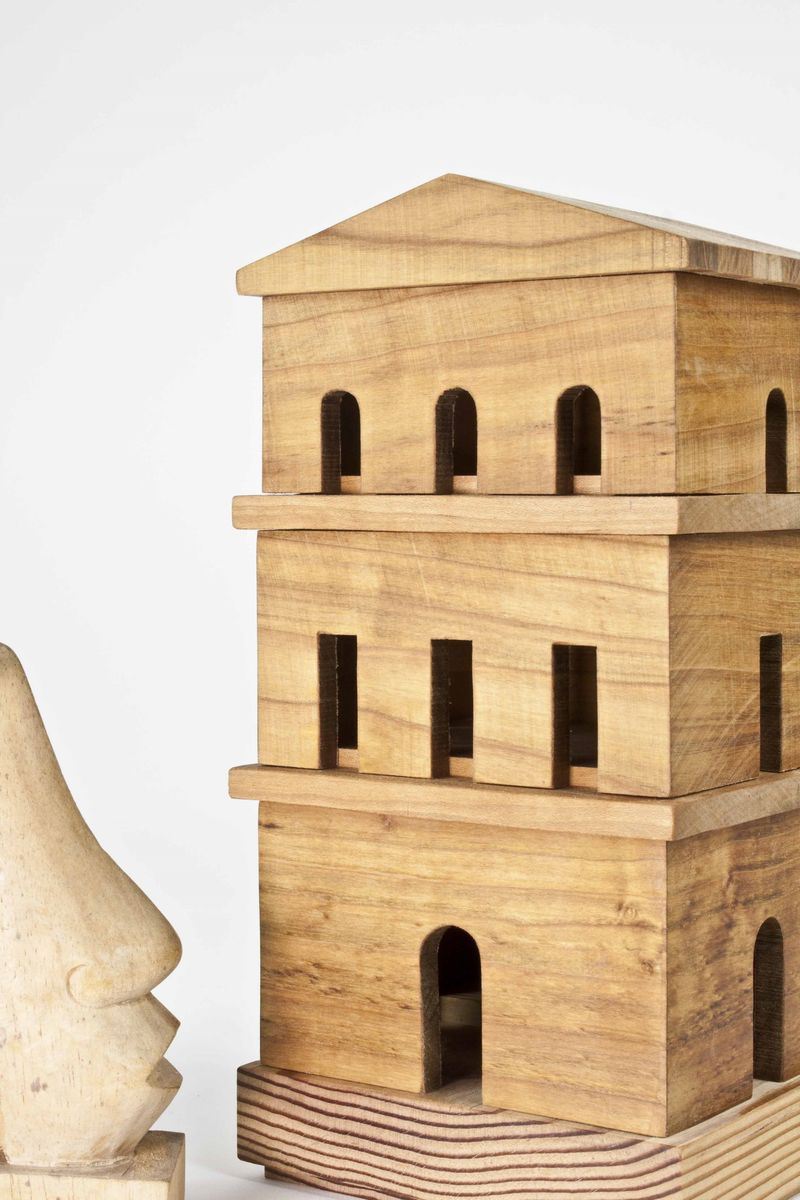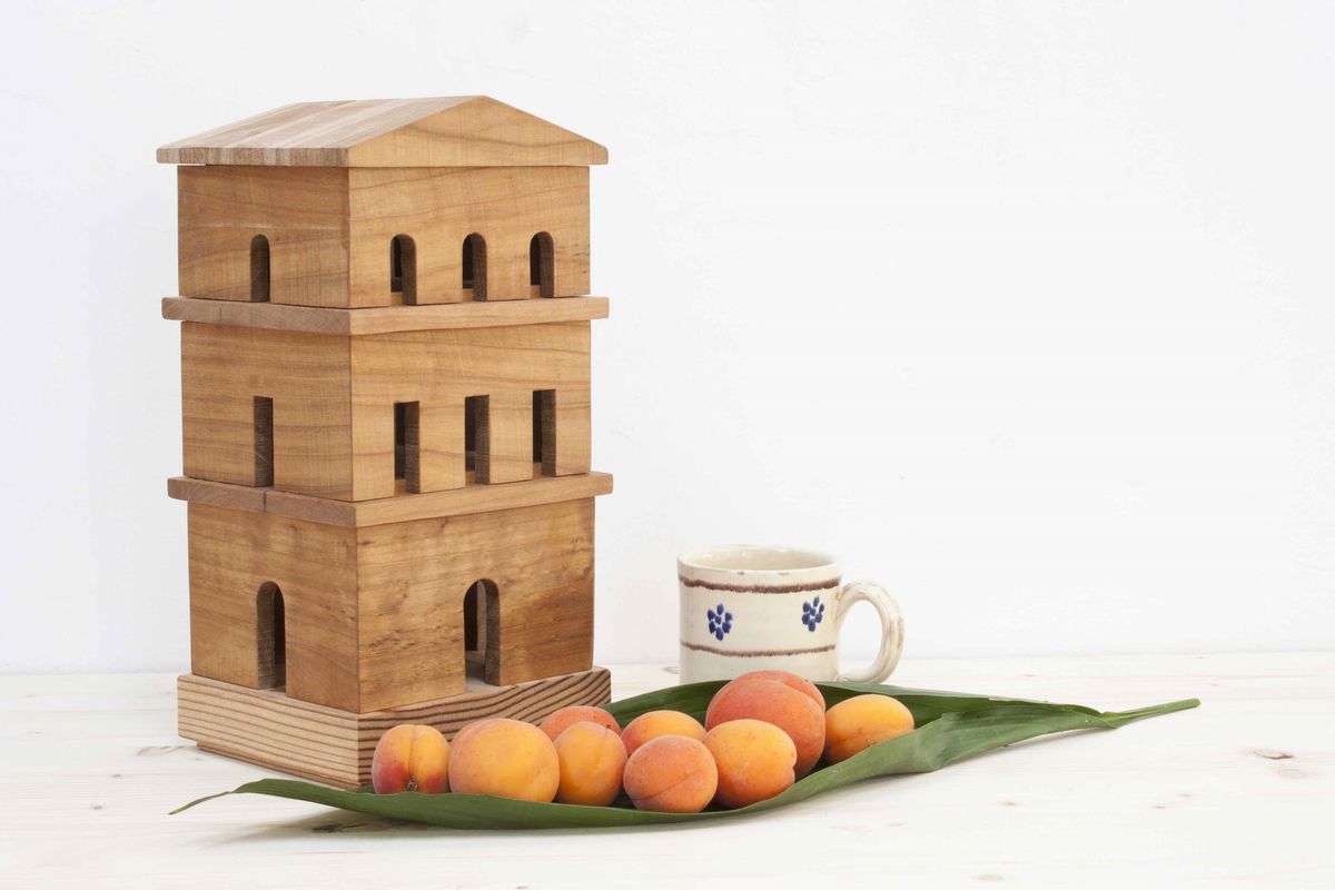 Box with three compartments in the shape of a temple built in solid cherry wood for the architecture and in solid larch for the base. Surface finish in straw yellow oil. The work is a unique piece belonging to the "Hierophanies" collection and built in 2021. Each compartment is interlocking with the neighboring pieces. The work is designed as a jewelry box.