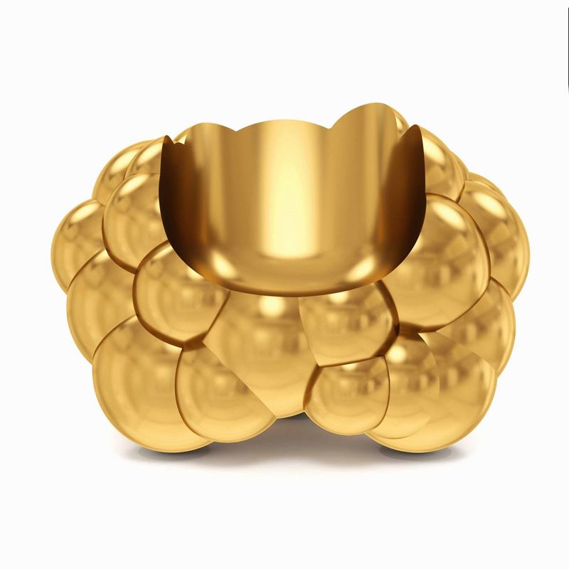 This regal gold chair is made in pure brass and designed for both style and comfort. It becomes the con- versation point in any space. It is almost surreal in appearance and an ergonomical triumph.