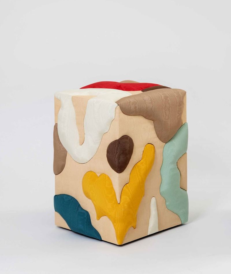 This stool is the result of research that revolves around the idea of imitation. The process starts with the use of moirè fabric, which is distinguished by a design that reproduces the typical