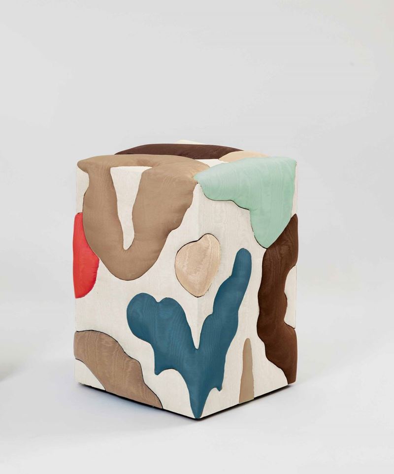effect of wood grain. Veins are repeated in the pattern of colored shapes that char- acterize the stool, and the divided sections of different moirè evoke the decorative process of wood inlay. Hence the idea of a seat padded with soft wood. The stool has been crafted by master upholsterer Gabriele Druetta.