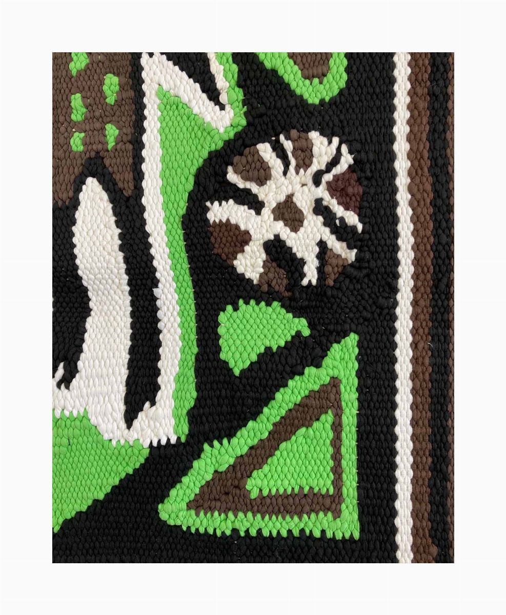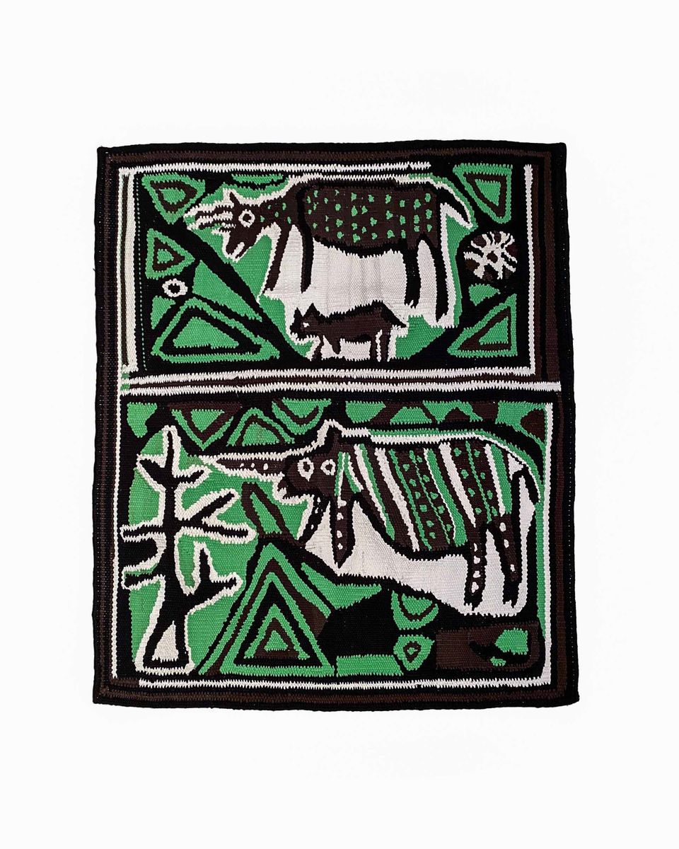 Another special reversible rug, designed and manufactured by South African designer Nawaaz Saldulker, in 2020, cotton with wildlife motifs in isolation, dimensions c. 156 cm x 123 cm. The Ellen Macarthur Foundation reports that if this trend continues, over 150 million tonnes of clothing waste will clog landfills by 2050. This rug is handwoven with discarded t-shirts, which is used as its raw material. A once-off handmade piece. The carpet is part of a small collection from a range, called '8 Acts Of Animal Confinement' made during quarantine in Austria while waiting for Covid-19 to subside. It was also part of D.A.C.(Designers Against Coronavirus) online exhibition curated by CaroselloLab, with concept and direction by Enrico Caputo and others.