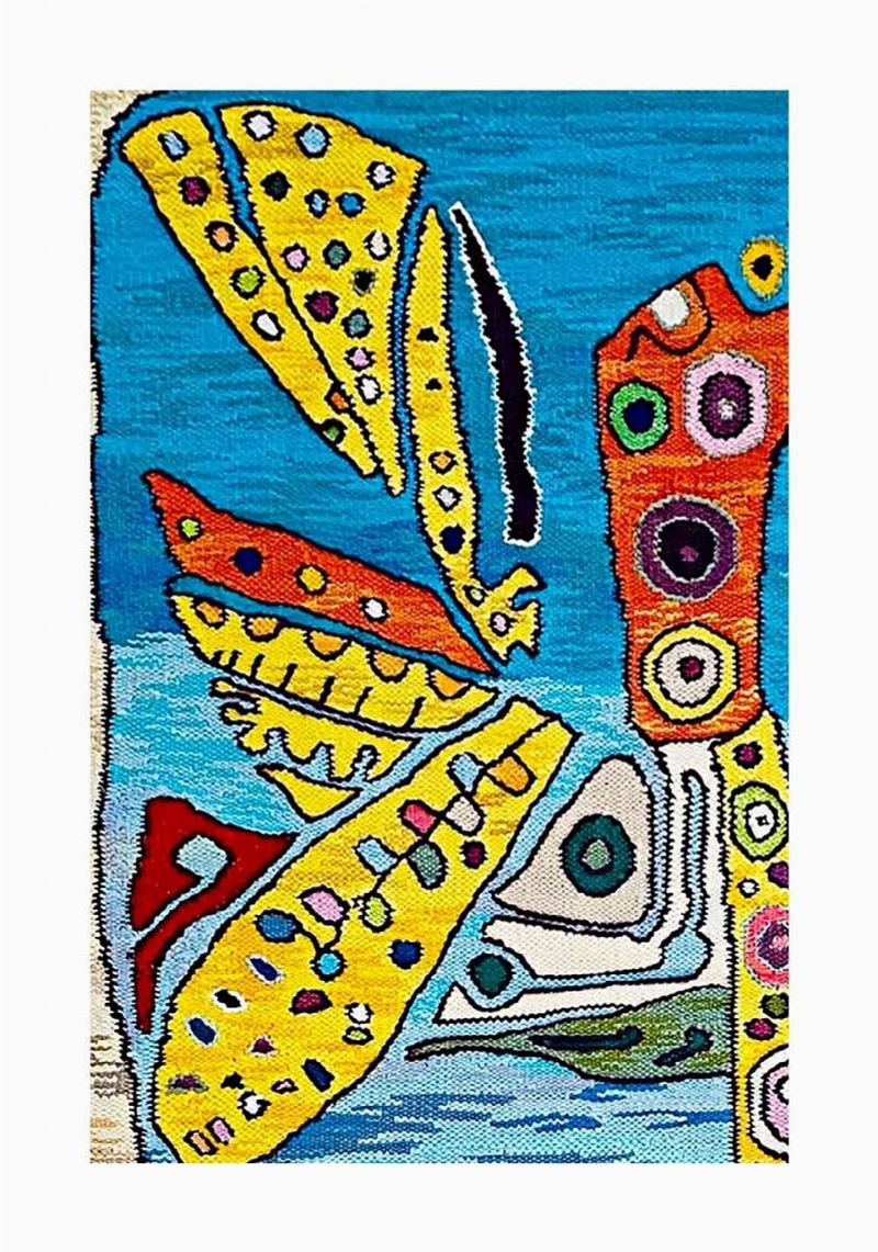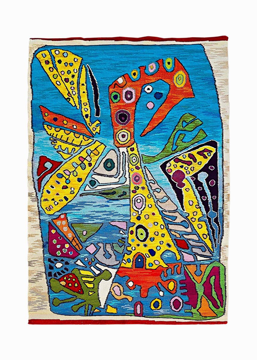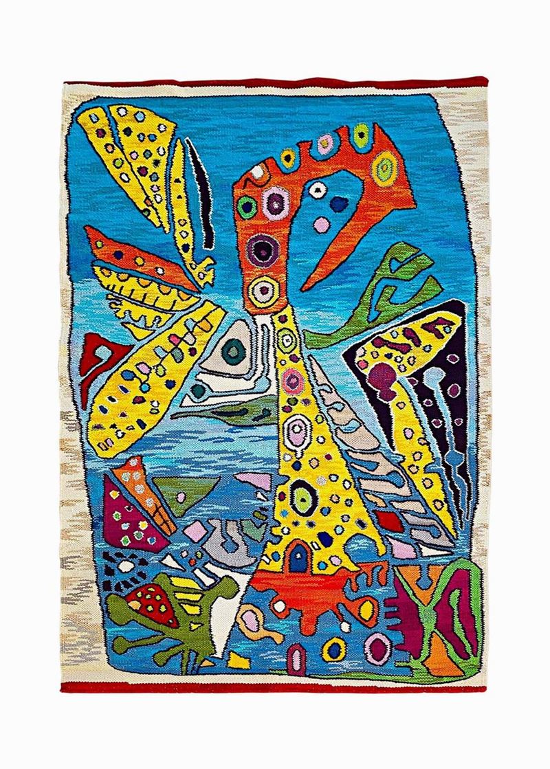 A collectible rug, designed and manufactured by South African designer Nawaaz Saldulker, in 2019, cotton material with motif of reimagined carnival float, dimensions c. 159 cm x 107 cm. Clothing has clearly become disposable. As a result, we generate more and more textile waste. A family in the western world throws away an average of 30 kg of clothing each year. Only 15% is recycled or donated, and the rest goes directly to the landfill or is incinerated. This rug is handwoven with discarded t-shirts, which is used as its neo-material.