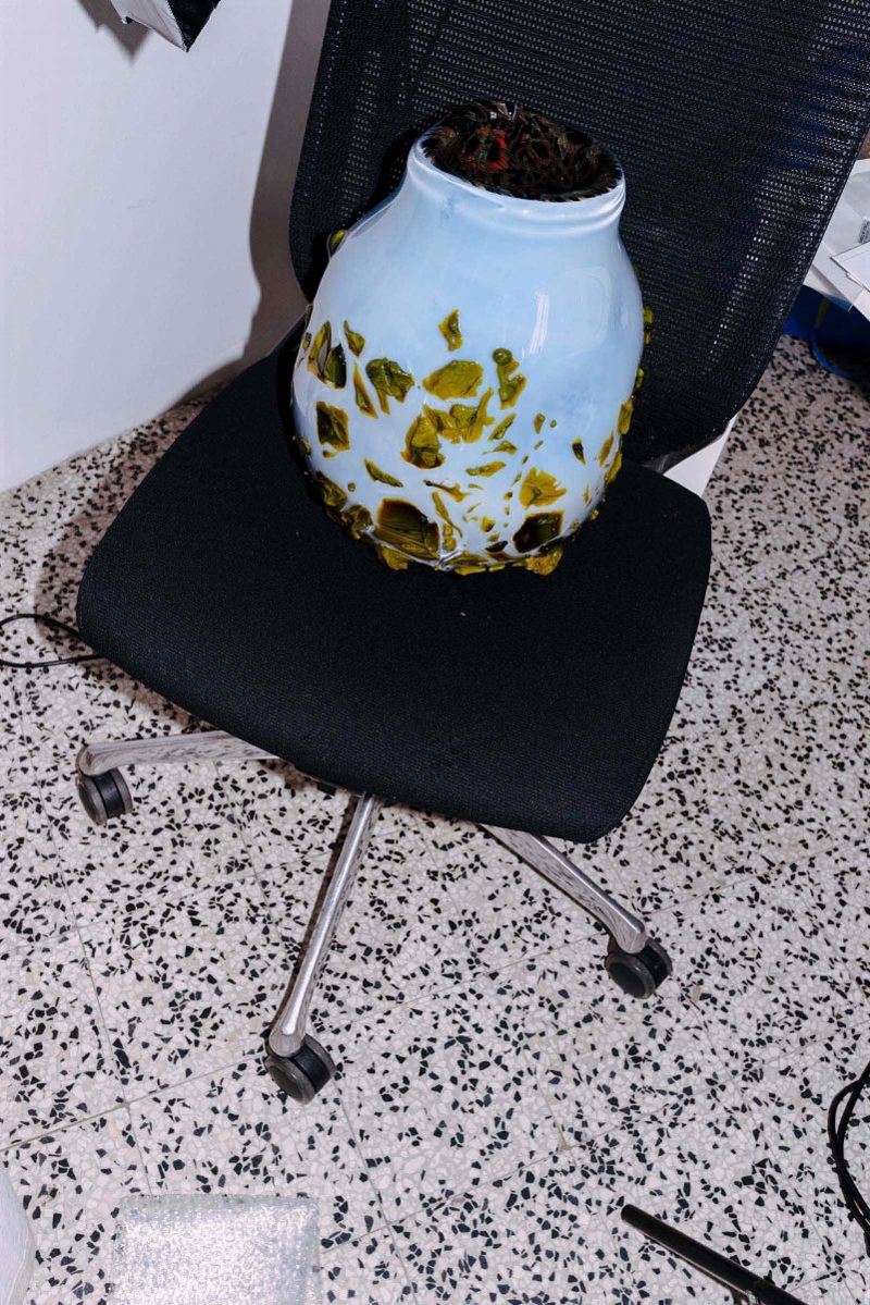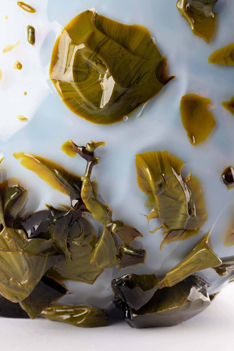 layer, a fusion of opal glass, is the second. Pieces of waste green glass "cotissi" are eventually melted on the middle and lower part of the double vase. The vase is part of the Bioma collection.