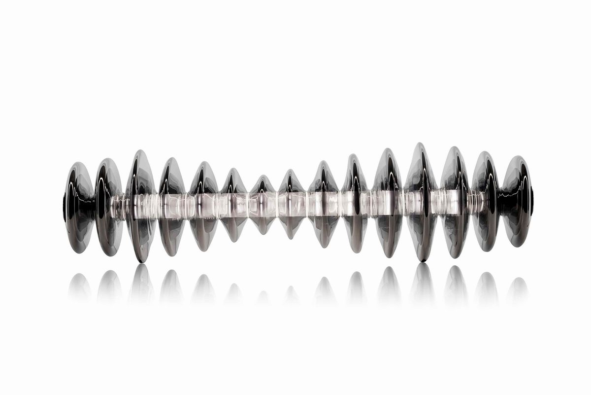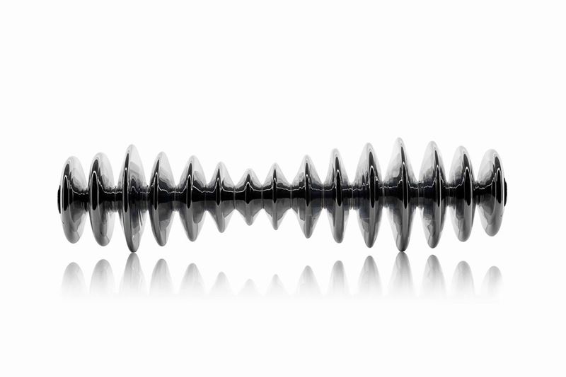 from black holes. The multimedia piece can be placed atop a plinth or suspended from a ceiling to create different types of auditory atmos- pheres. Made of hand blown glass, Echoes is a unique sculptural light comprising of Bluetooth and LED light source with built-in dimming system.