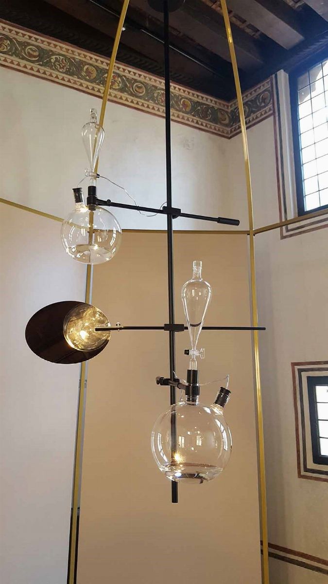 Lab Edition is a symbol of the connection between nature and man-made objects. Recalling alchemic instruments, light is captured by the liquid inside the spheres and reflected onto mir- rored disks, transforming it into a magical dazzle that embod- ies the entire piece. There is a moment when the sun hits the surface of a lagoon and creates a lens resemblance. This effect captures a “spark” and turns it into a source of light. Lab Edition captures this moment of ephemeral beauty: a ripple of light, a vibrant and lively reflection.