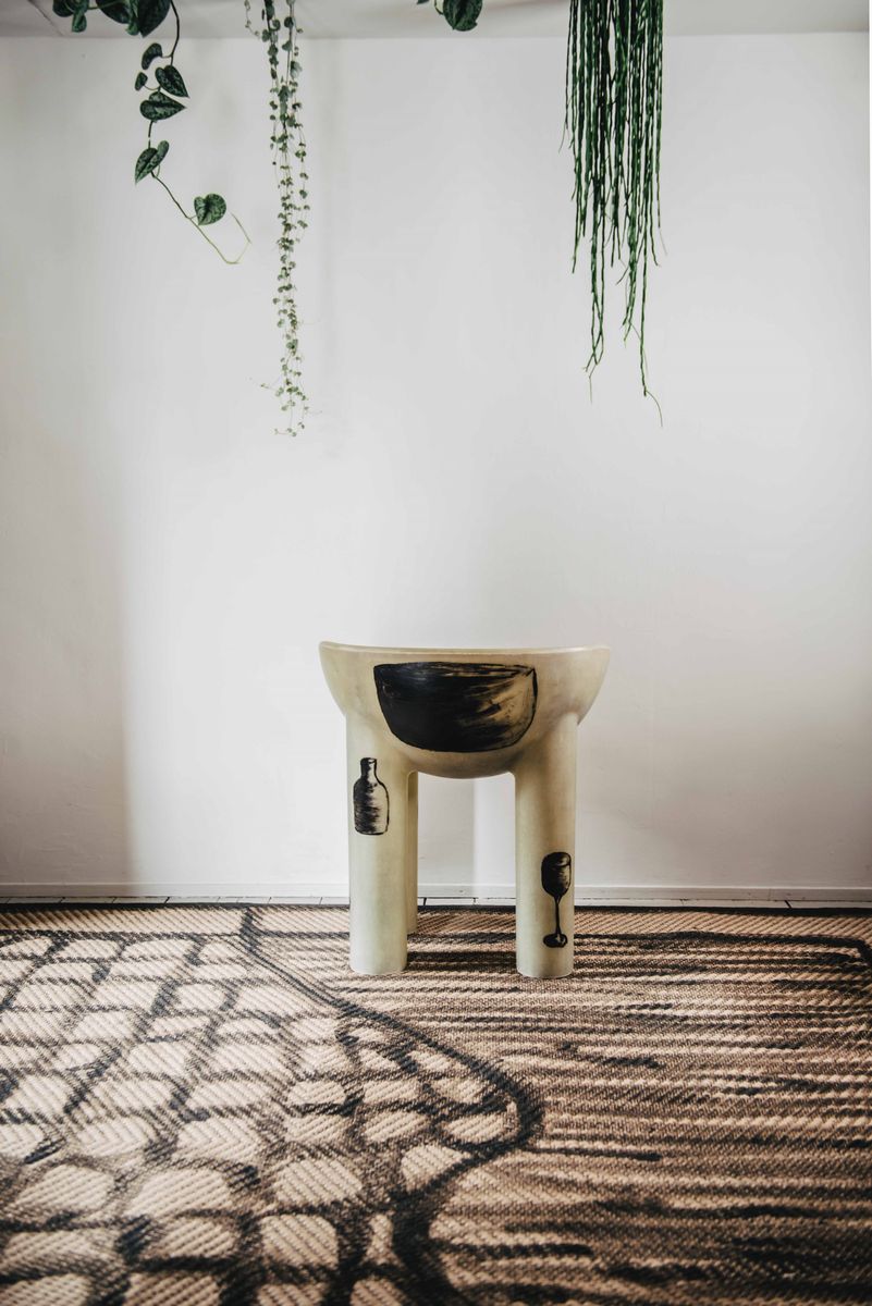 A taller iteration of the Roly-Poly Chair, this scoop-seated chair with four plump legs is cast as a single piece of fibreglass, in milky translucent fibreglass that evokes vintage Bakelite. Hand-Painted with charcoal resin depicting domestic abstract objects.
