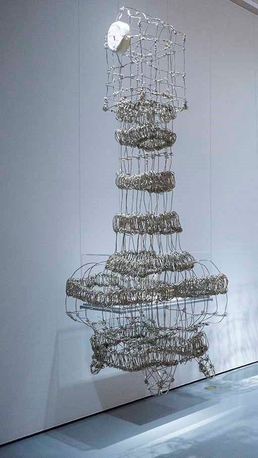 Showing only the skeleton of the object yet representing a function in full state, these metal wire pieces seem to float in space. Kiki takes a single line and transforms it into a whimsical sculptural piece. By inter- weaving a ceramic part she highlights its function.