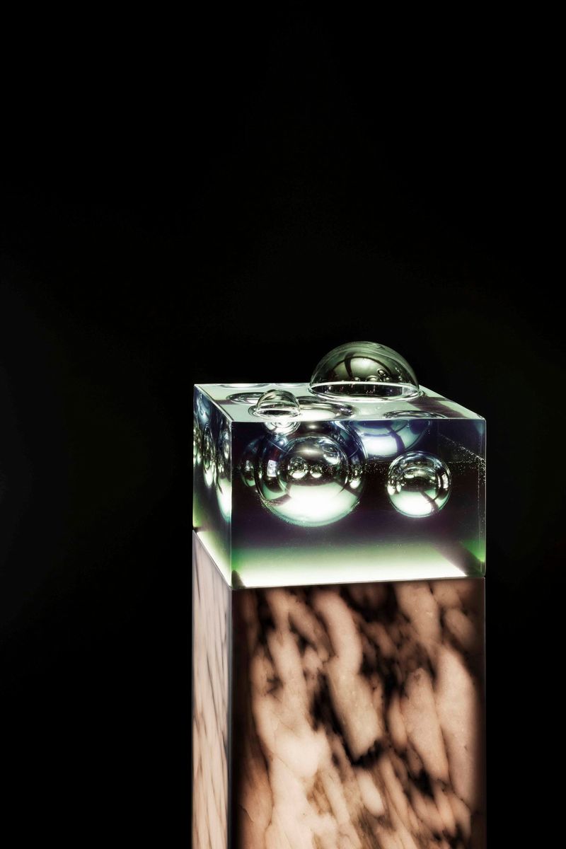 Rise focuses on the organic shapes of water bubbles and the refraction of light. Yoshimoto challenged the complex way light transmits and reflects inside differ- ent materials, resulting in a mesmerising visual effect.
