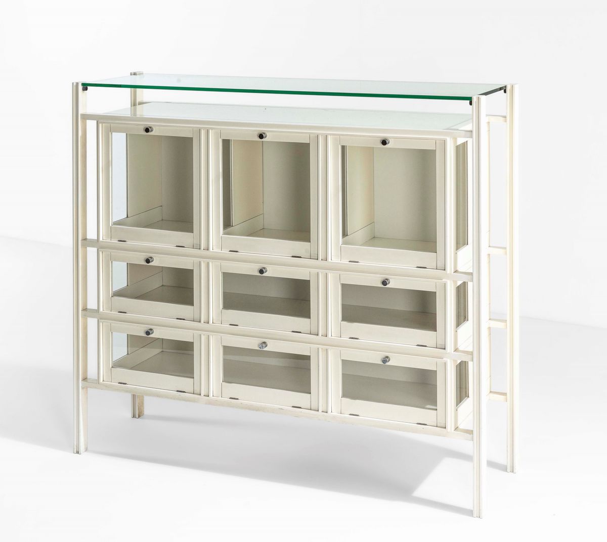 Mobile vetrina con struttura in legno laccato, piano in cristallo molato, ante a ribalta in legno ed elementi in vetro. Dettagli in ottone cromato.
