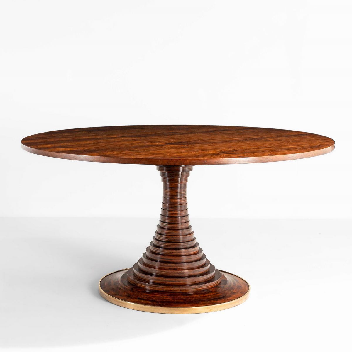Tavolo rotondo con struttura e piano in legno. Base in legno con profilo in ottone.