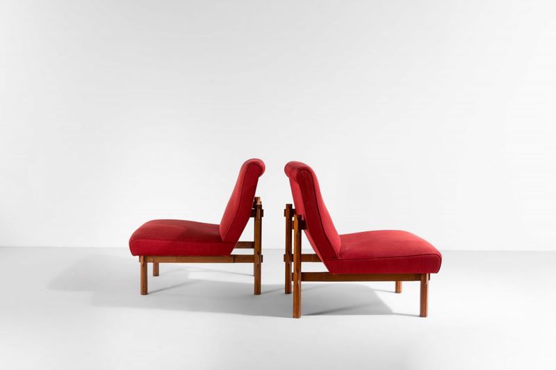Due poltrone mod. 869 con struttura in legno e rivestimenti in pelle.