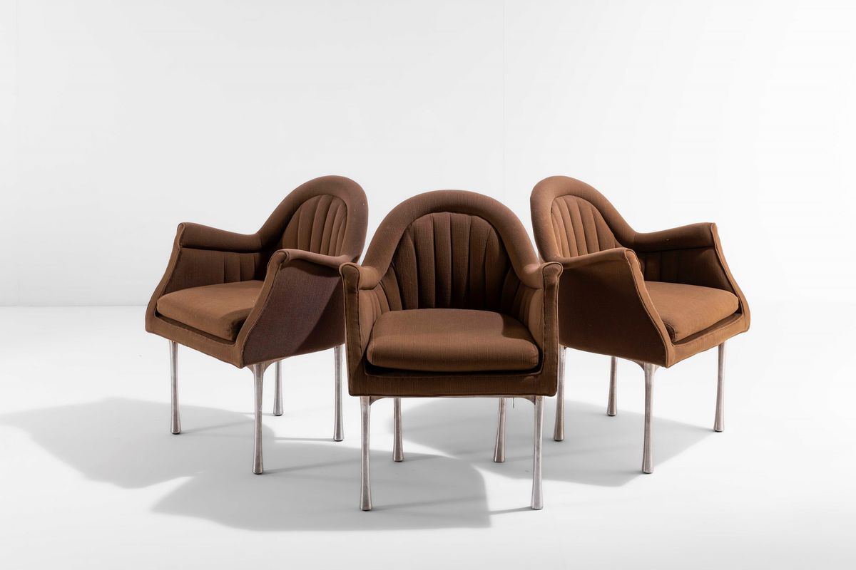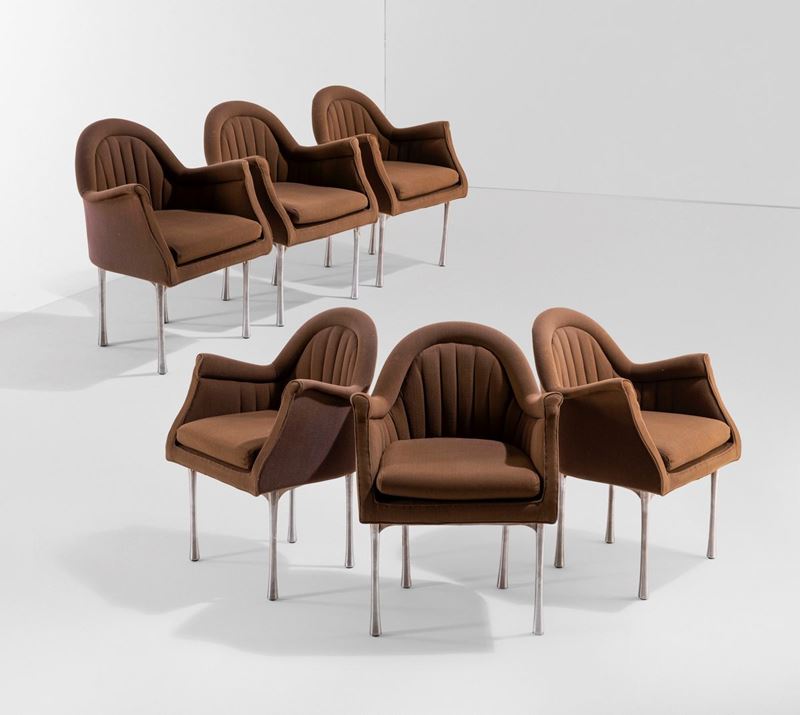Sei sedie con struttura in metallo, sostegni in acciaio e rivestimenti in tessuto.