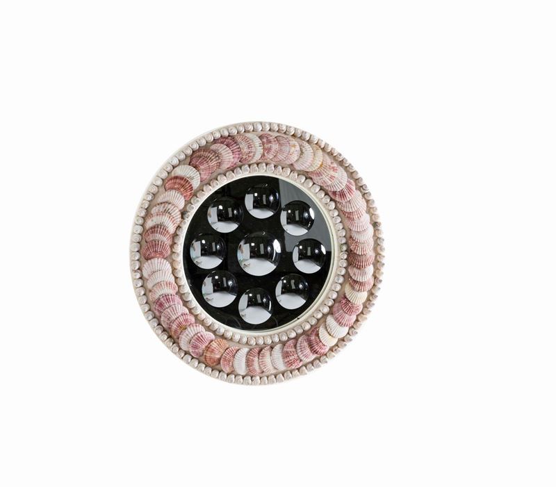 con cornice in legno laccato, cristallo specchiato a lente e applicazioni di elementi a conchiglie.