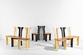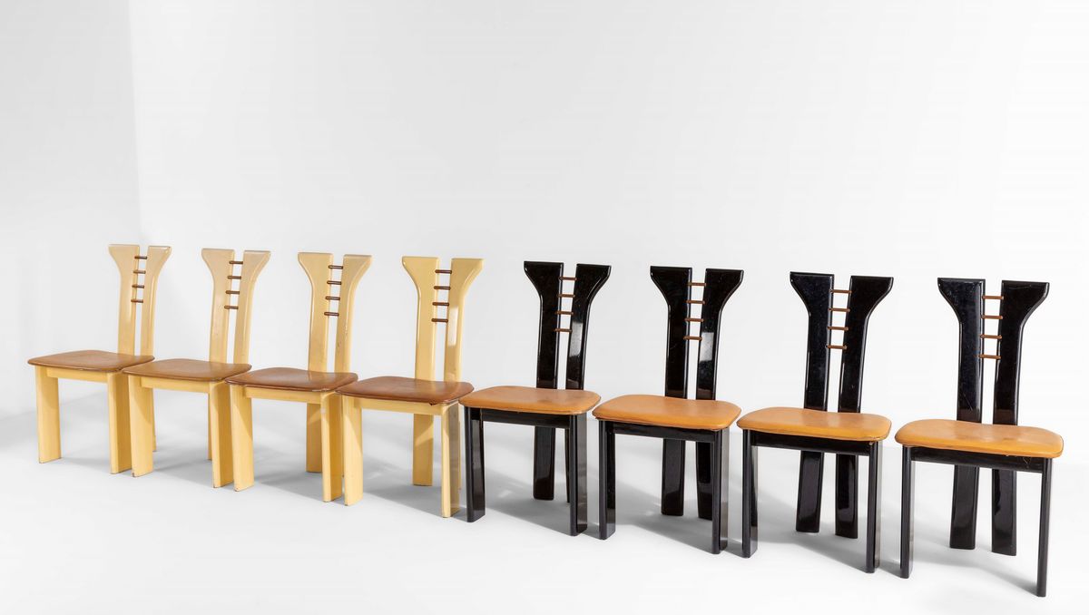 Set di otto sedie con struttura in legno laccato e legno in diverse essenza. Rivestimenti della seduta in skai.